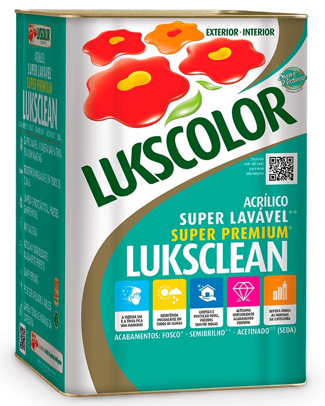 LUKSCLEAN ACRÍLICO SUPER LAVÁVEL SUPER PREMIUM é indicado para superfícies de alvenaria em áreas externas e internas em geral. LUKSCLEAN tem excepcional resistência à limpeza. Sua tecnologia inovadora permite que você limpe até manchas mais difíceis como: grafite, lápis de cor, solado de sapato, café, mostarda, catchup, chocolate, graxa, gordura, batom, entre outras, sem alterar o aspecto da pintura. Você limpa as paredes, externas e internas, com muita facilidade e o LUKSCLEAN fica sempre novo, sem as marcas de limpeza – Veja em “Dicas” os procedimentos corretos para limpar as paredes pintadas com LUKSCLEAN. Especialmente recomendado para ambientes hospitalares, clínicas, restaurantes, residências e áreas sujeitas à limpeza frequente, LUKSCLEAN atribui à superfície pintada um finíssimo disponível nos acabamentos fosco, semi-brilho e acetinado. LUKSCLEAN ACRÍLICO SUPER LAVÁVEL SUPER PREMIUM no acabamento fosco, reduz até 99% das bactérias* das parede, por um período de 2 anos da sua aplicação, conforme testes apresentados `Anvisa/ Ministério da Saúde. Com Suave Perfume, proporciona conforto e bem-estar, permitindo a sua permanência no ambiente do início ao fim da pintura. Produto de baixíssimo respingo, o que significa menos sujeira durante a aplicação. Este produto apresenta cobertura e rendimento superior, altíssima durabilidade e resistência às ações do tempo e a fungos (mofo), excedendo em todos esses quesitos, as normas estabelecidas para a categoria Super Premium pelo Programa Setorial de Qualidade para Tintas Imobiliárias (PSQ-TI)