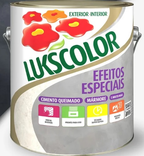 LUKSCOLOR EFEITOS EPECIAIS é um produto que proporciona aos ambientes um acabamento que vai do estilo rústico urbano, característico do cimento queimado, utilizado em ambientes externos e internos, ao requintado toque glamouroso da pedra mármore, que pode ser aplicado em ambientes internos não molháveis e externos devidamente cobertos, além de inúmeros efeitos que podem ser elaborados de acordo com sua criatividade. É um produto pronto para uso, com secagem super rápida, ótima aderência, excelente rendimento e fácil aplicação que permite a transformação do seu ambiente. Disponível em 3 cores prontas: Cimento Queimado Claro, Cimento Queimado Médio, Cimento Queimado Escuro, em centenas de cores no sistema tintométrico LUKSYSTEM.